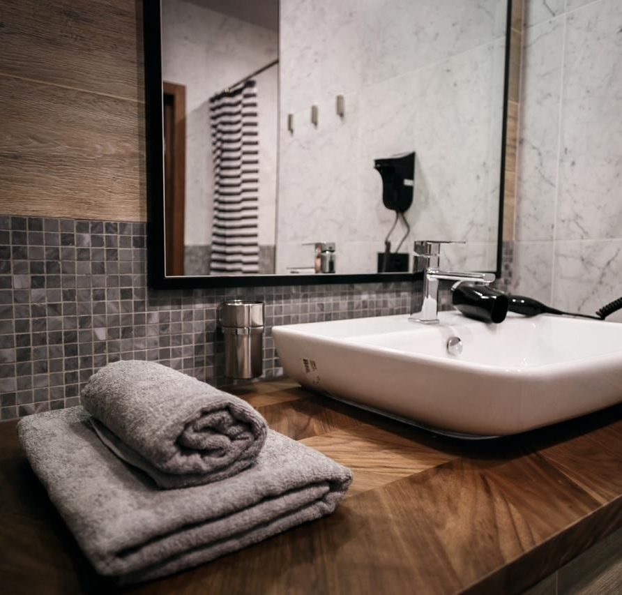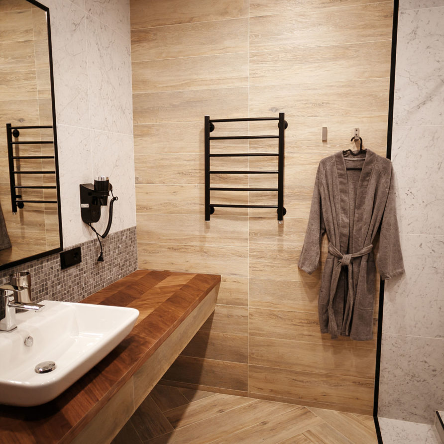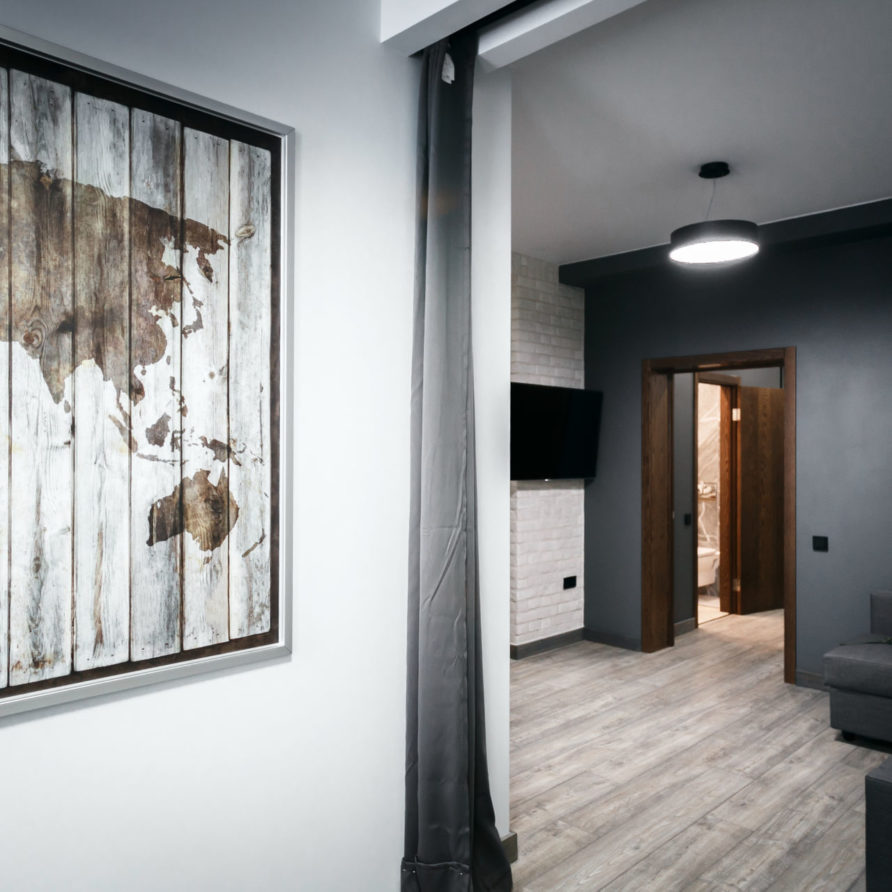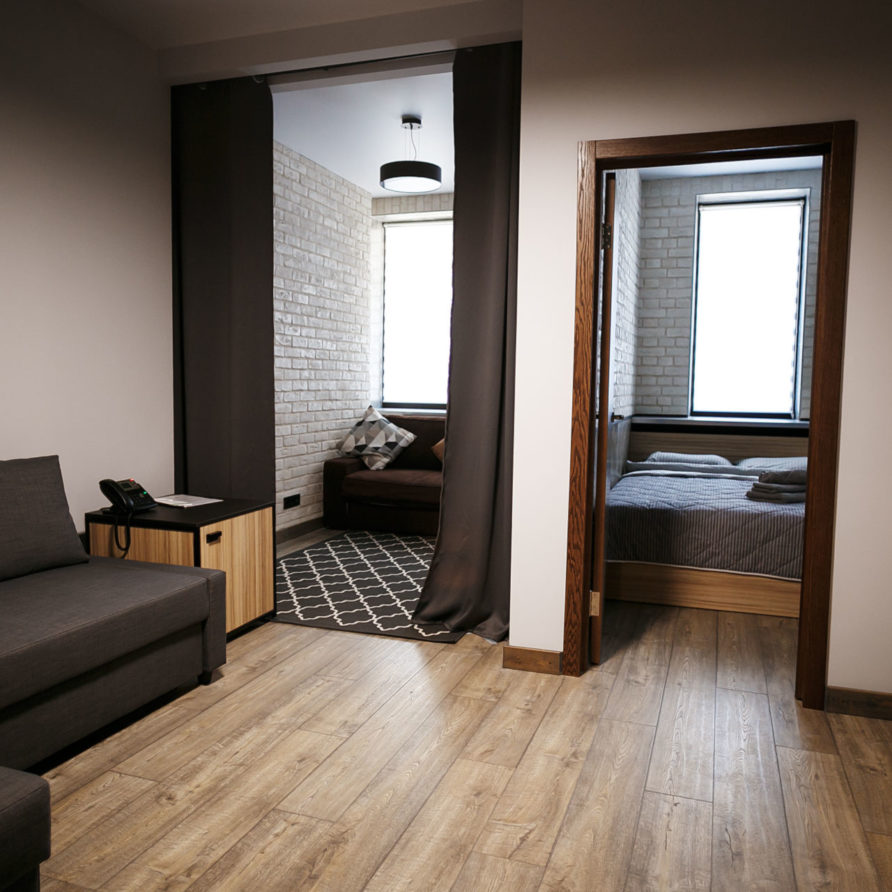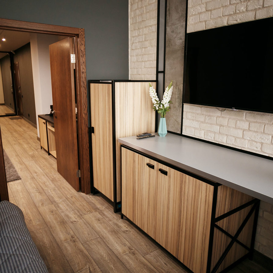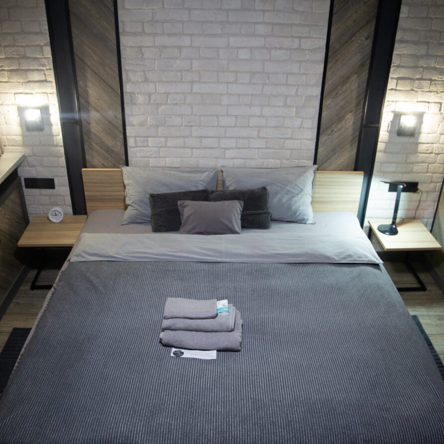 Номер «Люкс» состоит из одной комнаты и холла. Комната оснащена двуспальной кроватью, столом, удобным мягким стулом, тумба-холодильник, бытовые приборы (фен, телевизор, кондиционер, телефон). Небольшой холл оснащен встроенным шкафом и пуфом. Санузел совмещенный (душ и туалет). Номер рассчитан на проживание от одного до трех человек.