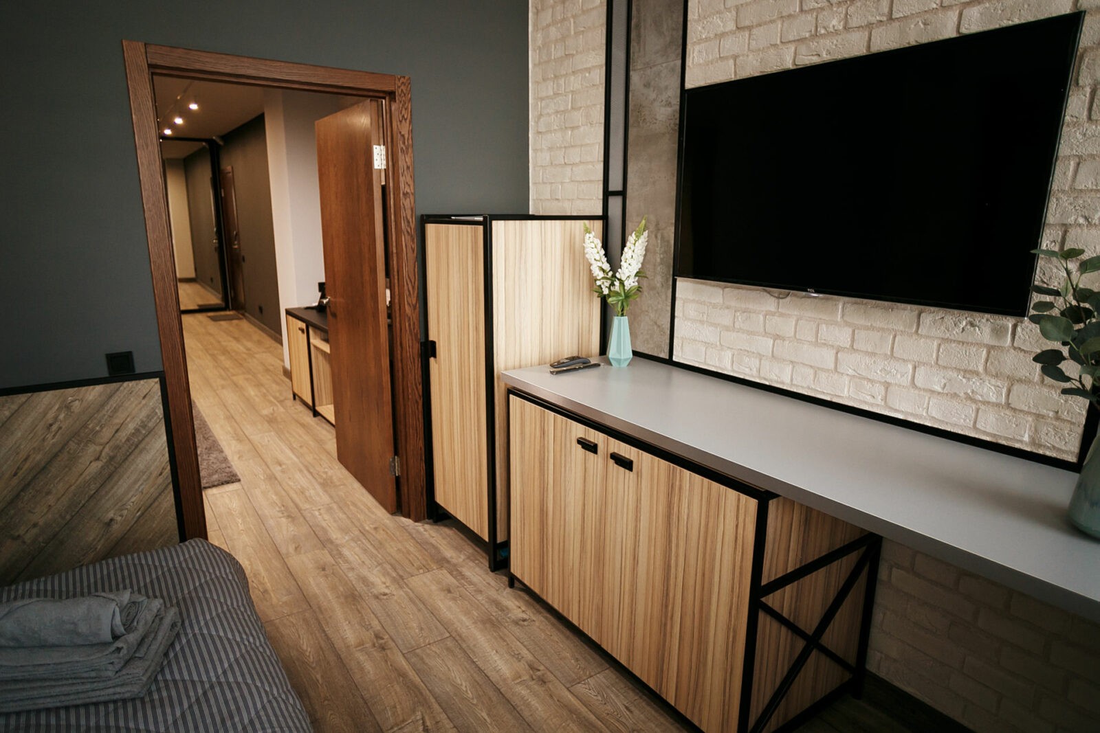Номер «Люкс» состоит из одной комнаты и холла. Комната оснащена двуспальной кроватью, столом, удобным мягким стулом, тумба-холодильник, бытовые приборы (фен, телевизор, кондиционер, телефон). Небольшой холл оснащен встроенным шкафом и пуфом. Санузел совмещенный (душ и туалет). Номер рассчитан на проживание от одного до трех человек.